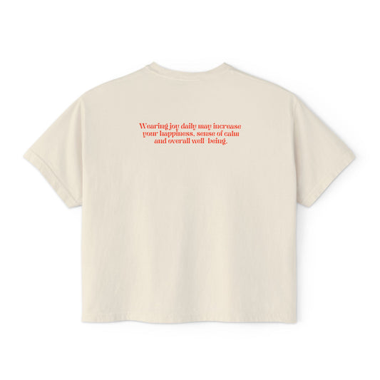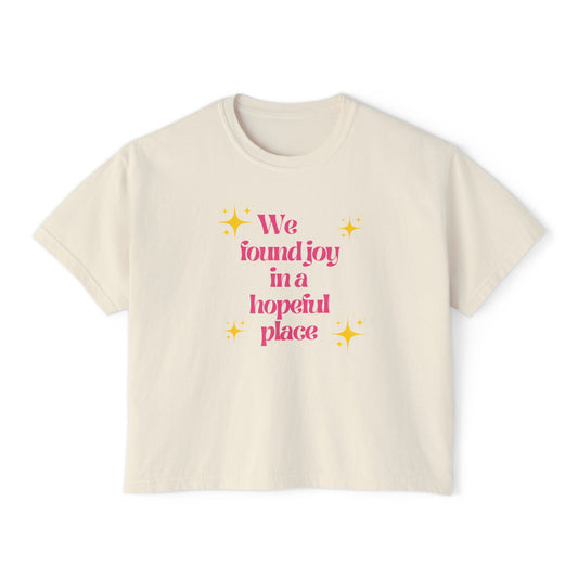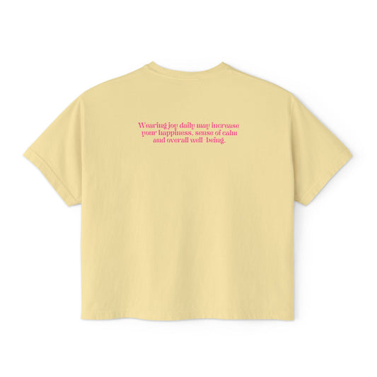 I love my I Choose Joy shirt! The quality and color are excellent. I love the fit too. I am 5’9 and it is the perfect crop, hitting right at the top of pants or shorts. I got a Medium and it’s a little oversized/boxy, which I love, yet fits perfectly in the shoulders. I highly recommend!